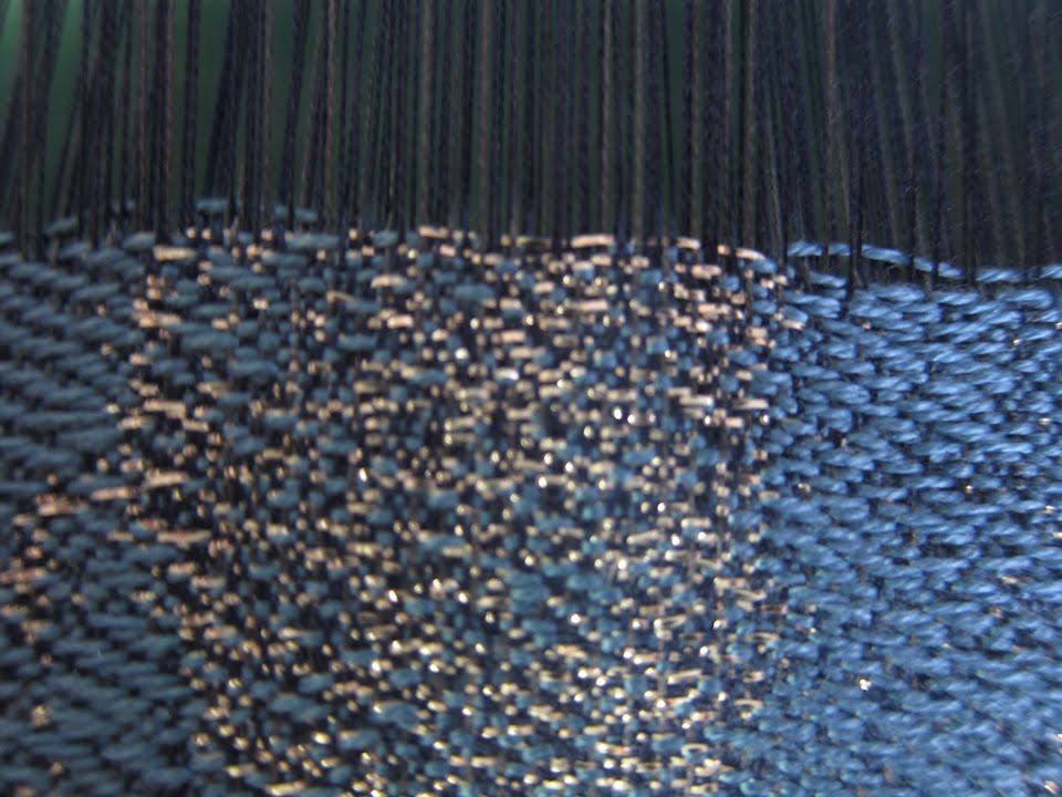 I am weaving a pair of sky weavings: "East" and "West". Two wefts alternate, a blue tencel and a silver gimp, in structures that bring one to the front and the other to the back ((weft-backed structures). When you combine structures in one weaving, you have to be sure that one is not significantly tighter than the other, or you will have take-up problems. In theory my five structures were compatible, but in fact they weren't. I created an image file that was pixelated, and the switching between structures happened so often in some areas that the wefts could not pack down evenly. You can see what happens in the two images below: the fell line of the cloth becomes uneven and the reed cannot hit the cloth evenly.